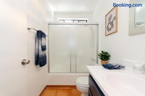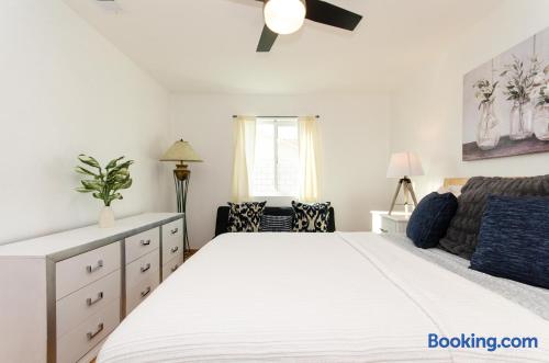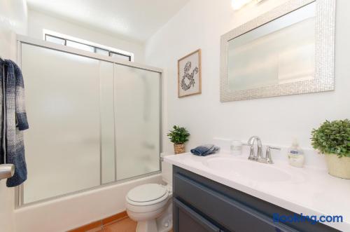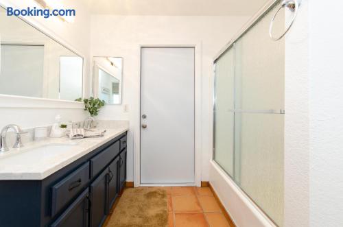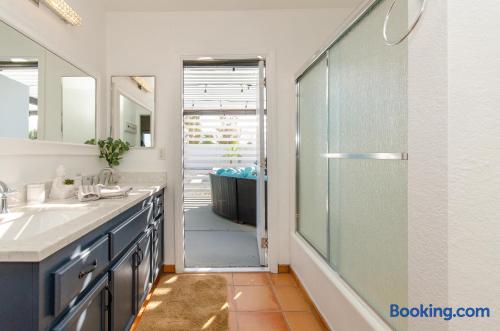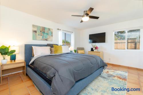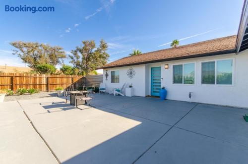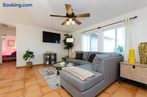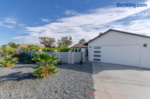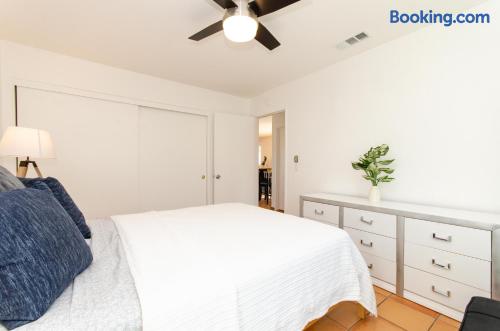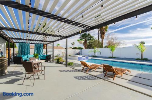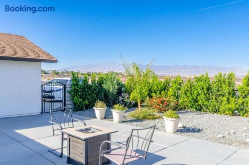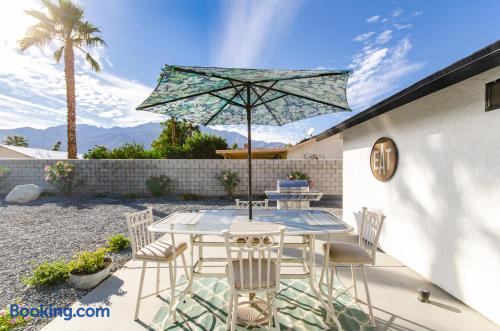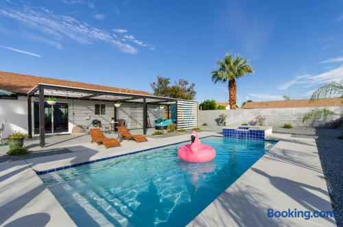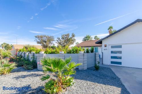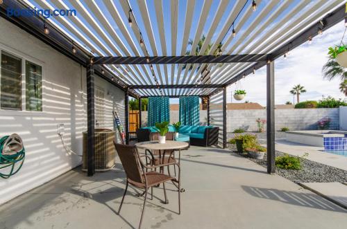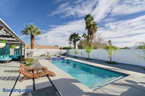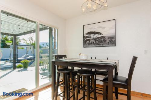 This beautiful single-story home in Palm Springs offers a stunning swimming pool and hot tub with unbeatable views of the mountains, making it the perfect retreat for families or close-knit groups of friends. Immerse yourself in year-round sunny weather and enjoy the endless adventures that Palm Springs has to offer. The spacious primary bedroom features a King-size bed, a smart television, and an en-suite bathroom with a shower and tub, along with double vanities for added convenience. The two additional guest bedrooms offer Queen-size beds, ceiling fans, and comfy linens. For additional sleeping space, there’s a futon bed in the house and a couch in the living room. Bedrooms two and three share a hallway bathroom, which also provides direct access to the outdoor pool deck. This home is ideally located just minutes away from Downtown Palm Springs, the Palm Springs Art Museum, Indian Canyon hikes, and a wide variety of restaurants and coffee shops. Golf courses, tennis courts, and other activities are nearby. A short drive on I-10 or Highway 111 East takes you to neighboring desert cities like Palm Desert, home to the famous El Paseo shopping district, or to the Coachella and Stagecoach Music Festivals in Indio. Being a Good Vacation Rental Neighbor: This vacation rental is located in a peaceful and tranquil residential neighborhood, making it perfect for your next poolside getaway. To maintain the serenity of the area, we ask that you respect the neighbors and adhere to all house rules. To ensure a peaceful environment, guests must follow both city and house rules. The city of Palm Springs prohibits music, loud noise, parties, events, street parking, and disruptive behavior. Quiet hours are from 9:00 PM to 10:00 AM, and guests are asked to be inside and mindful of the neighbors during these hours. The maximum overnight occupancy is strictly enforced and cannot exceed the posted limit for the property.