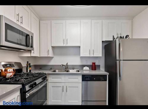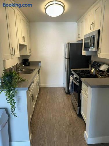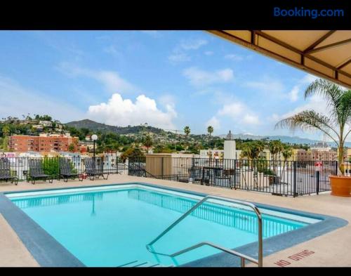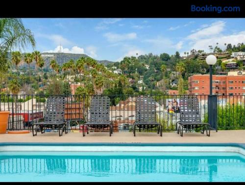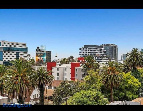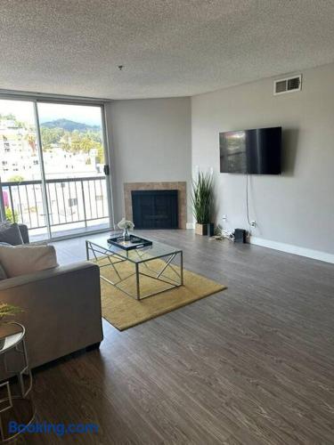 This is not a hotel. Located in lively Hollywood, this 2-bedroom apartment offers a rooftop pool and deck with 360-degree views of the Hollywood Sign and Downtown. Onsite parking is available. Within walking distance to Hollywood’s top attractions, with quick access to studios, downtown, and Universal Studios. For guest safety and privacy, the exact address will be provided after booking. The listed address is nearby and just a few minutes away.